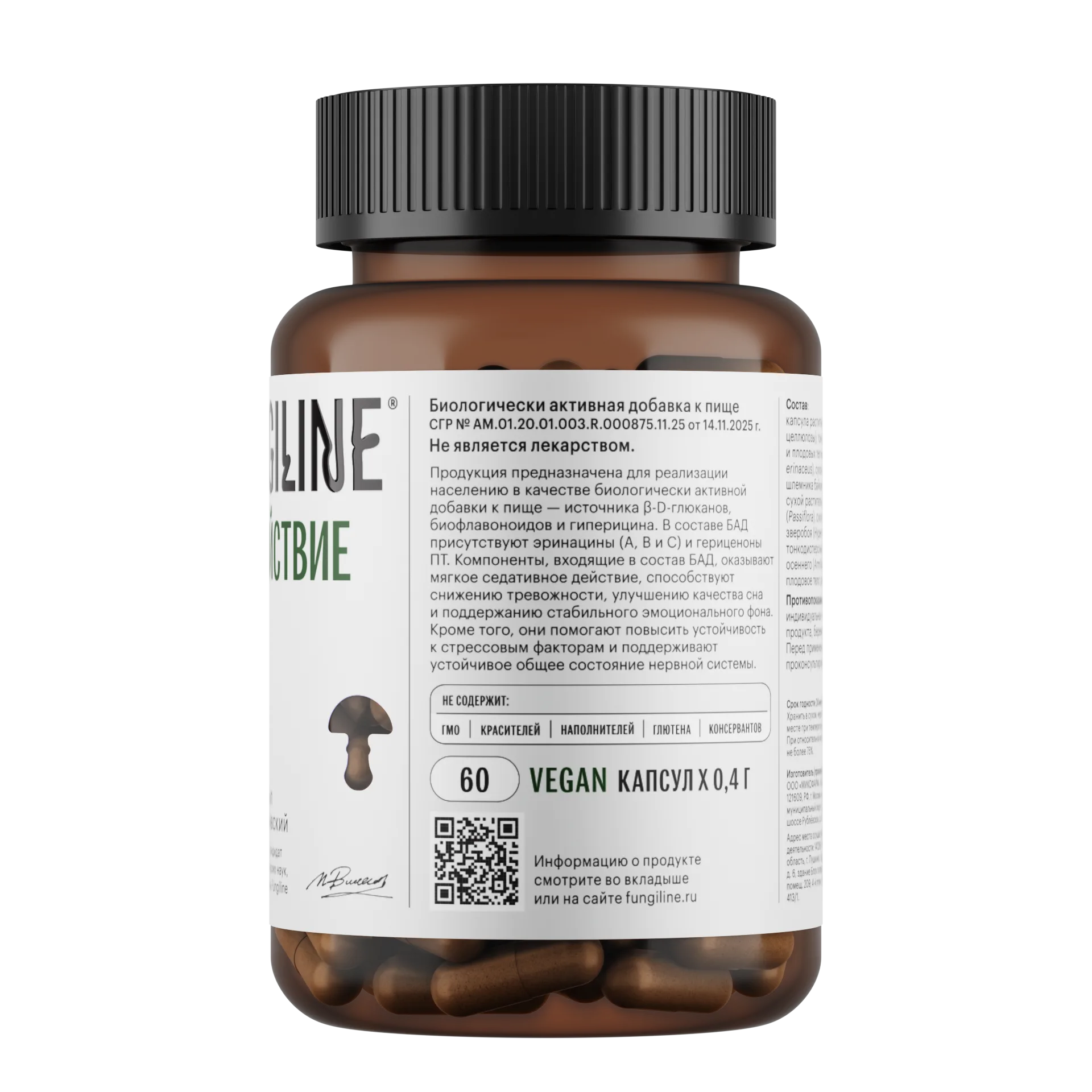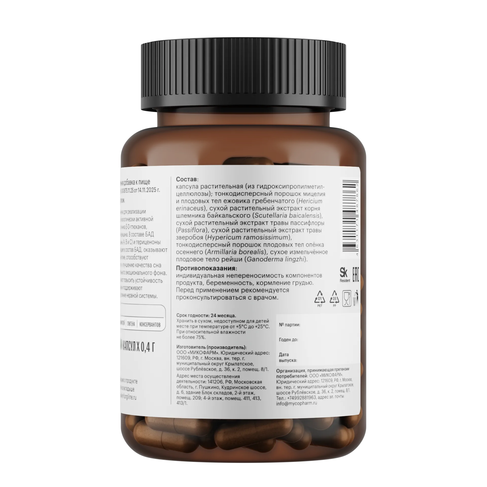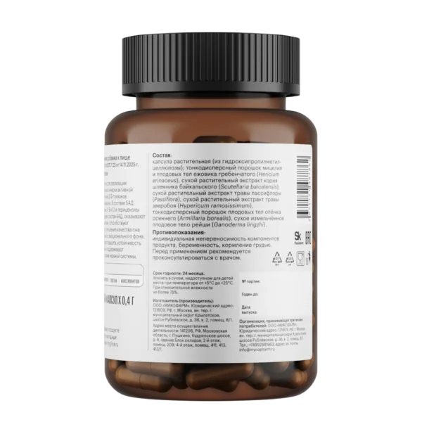 Тонкодисперсный порошок мицелия и плодовых тел ежовика гребенчатого (Hericium erinaceus) низкотемпературной сушки, тонкодисперсный порошок плодовых тел опёнка осеннего (Armillaria borealis) и рейши (Ganoderma lingzhi) низкотемпературной сушки; растительные экстракты зверобоя (Hypericum ramosissimum), шлемника байкальского (Scutellaria baicalensis) и пассифлоры (Passiflora).
